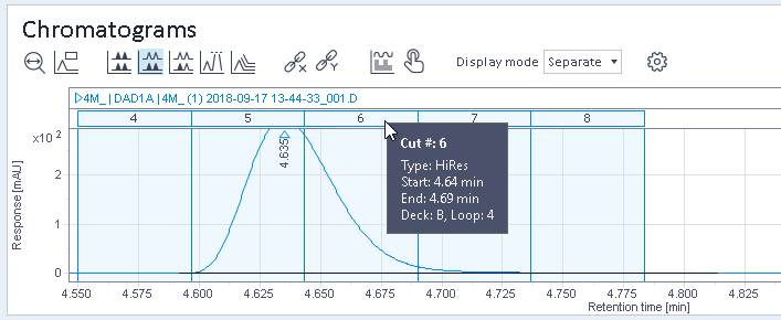 A tool tip shows additional information such as cut number, type of 2D-LC sampling (MHC, HiRes, etc.), start time, end time and, if available, information about the used deck and loop.