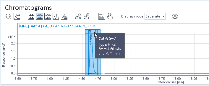 In the Chromatograms and Diagnostic Signals windows, cuts are displayed with a colored background. A header above the graph displays the cut numbers.