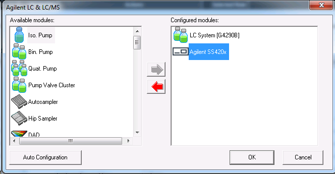 Within the configuration dialog, select Agilent SS420x at available modules list and click right arrow button in order to add the module to list of configured modules.