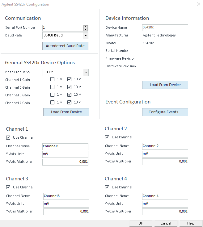 For each channel used in this instrument, specify Channel Name, Y-Axis Unit, and Y-Axis Multiplier.