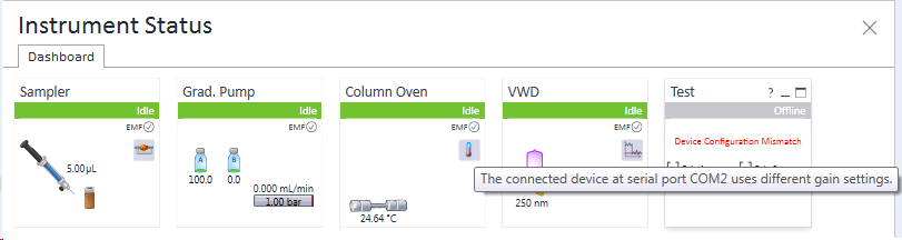 If module channels are split between multiple instruments (for example, Instrument 1 uses channel 1 and Instrument 2 uses channels 2, 3, and 4) it is mandatory that all Communication and General SS420x Device Options are set to the same value on all Instruments connecting to same module. If this requirement is not met, the device can not be connected and the status will display problem details like this (to show more detail, move the mouse d to the error display Device Configuration Mismatch).