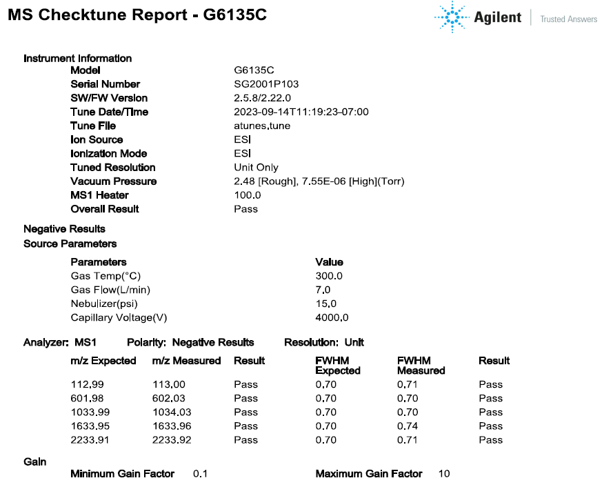 m/z 基準ピークは、チューニング液のターゲット質量の ± 0.1 amu 以内にする必要があります(標準チューニング液には m/z 113、602、1034、1634、2234 が含まれます)。