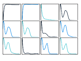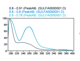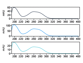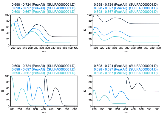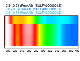 等高線プロット形式では、スペクトルは吸光度のカラーコードとともに表示されます。複数のスペクトルは、それぞれの下に表示されます。