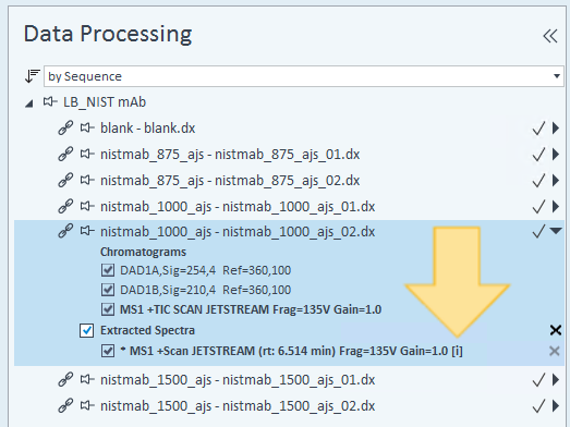 MS 스펙트럼에 대해 일관되지 않은 디콘볼루션 결과가 저장될 수 있습니다. 처리 방법의 디콘볼루션 파라미터가 변경되고, 업데이트된 분석법 설정으로 디콘볼루션이 다시 실행되지 않은 경우 데이터를 재처리할 때 불일치가 표시됩니다. 일관되지 않은 디콘볼루션 결과를 표시하기 위해 스펙트럼 이름에 [i]가 추가됩니다. 불일치를 제거하려면 스펙트럼 디콘볼루션을 다시 실행합니다.