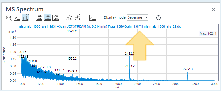 스펙트럼 디콘볼루션 결과는 처리 방법의 스펙트럼 분석 > MS 스펙트럼 디콘볼루션 섹션의 설정에 따라 결정됩니다.