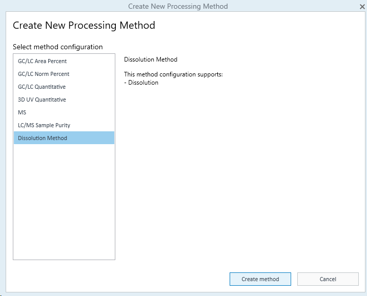 3. Select the appropriate method configuration e. g. Dissolution Method and click Create method.