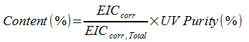 Once all the EIC areas have been corrected, the relative percentage (Content(%) ) is calculated for each component. Content(%) is then reported based on the limit of quantitation (LOQ) and Limit of Detection (LOD).