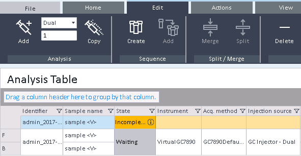 After clicking Split you will get two single analyses in Waiting or Incomplete state (depending on the state before the split). With the exception of the injection source and the identifier, the values from the dual analysis are retained for each single analysis.