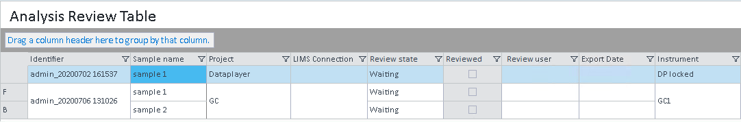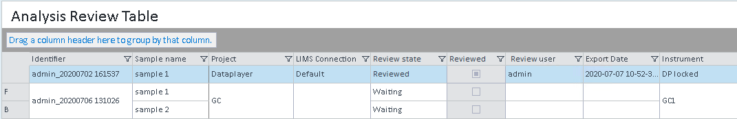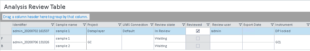 Make sure the review-related columns are displayed in the Analysis Review Table. Click Reviewed in the View ribbon tab and select the parameters you want to display.