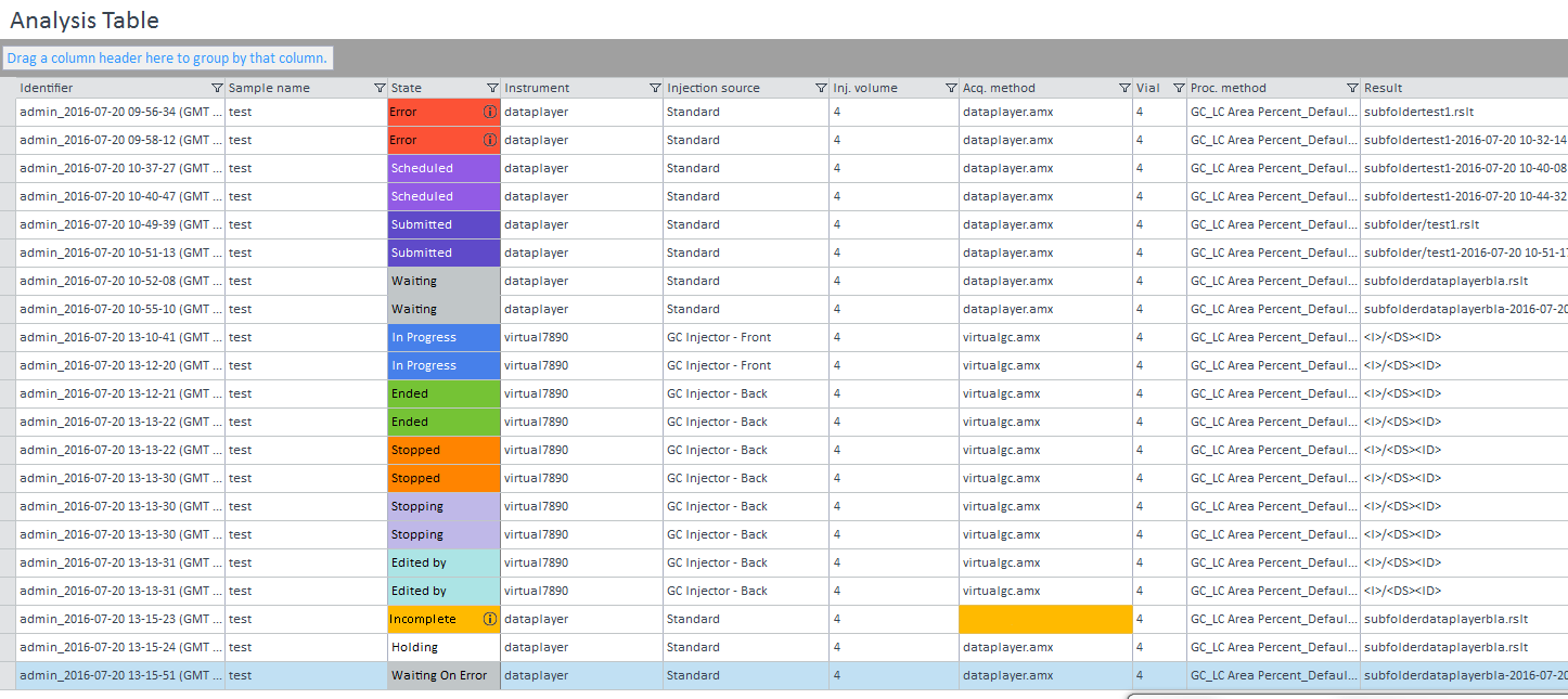 An analysis launched on a single injection source instrument is displayed on a single line in the Analysis Table. A dual injection is displayed on a dual line.