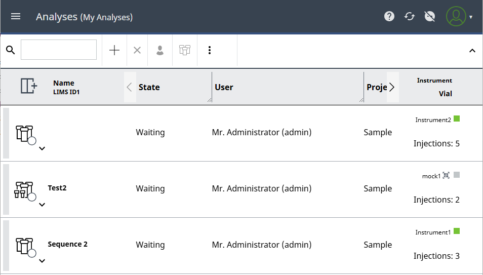 The Analyses view opens. The selected filter criterion is displayed in the Analyses bar. Only the analyses that are assigned to you are displayed.