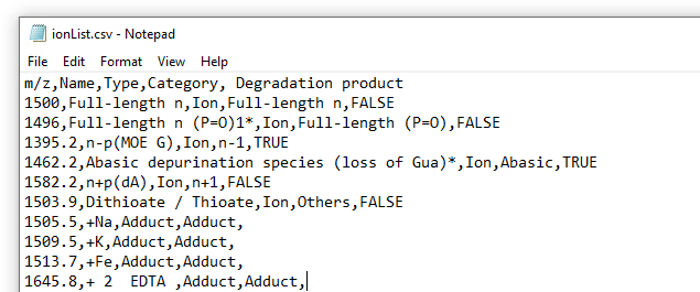确保离子列表包含全长产物的钠加合物(FLP 的 m/z + 5.5)和全长产物的磷酸二酯(FLP 的 m/z - 4)。如果这些离子缺失,则加载离子列表时会显示错误。
